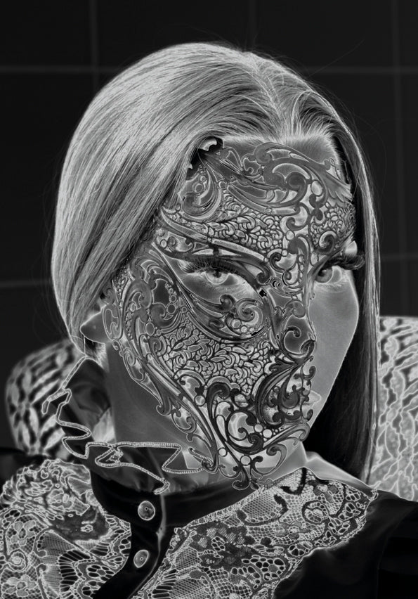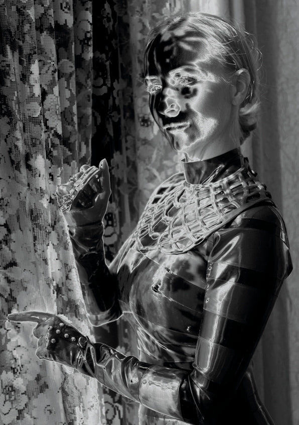 Für diesen Bildband hat Sven Hoffmann eine Auswahl seiner bisherigen Motive aus der Strenge Dame Reihe in der Dunkelkammer nachträglich solarisiert. Die Pseudosolarisation, auch als Sabattier-Effekt bekannt, ist eine Dunkelkammertechnik, bei der ein Papierabzug während der Entwicklung diffus nachbelichtet wird, sodass Tonwerte partiell umkehren: Helles kippt ins Dunkle, Dunkles wird aufgehellt, und an den Konturen entsteht oft ein feiner, leuchtender Saum. Berühmt wurde diese Technik durch Man Ray und Lee Miller, die sie in den 1920er- und 1930er-Jahren als gestalterisches Mittel einsetzten, um Körper und Objekte in einen surreal schwebenden Zwischenzustand zu versetzen.