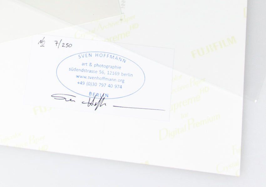 Paperback, 148 Seiten, 4-farbig, Format 29,7 x 21 cm, Limited Edition von 250 Exemplaren, mit beiliegendem Originalphoto von Sven Hoffmann (Laserprint auf Fujicolor Crystal Archive Paper Supreme, 21x30 cm), signiert und nummeriert, gestempelt.